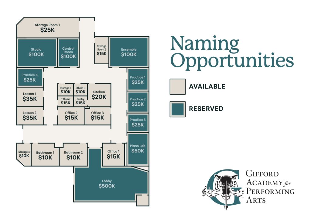 From the building lobby to practice rooms, lesson rooms, kitchen, studio, and more — many options remain available at a range of giving levels.